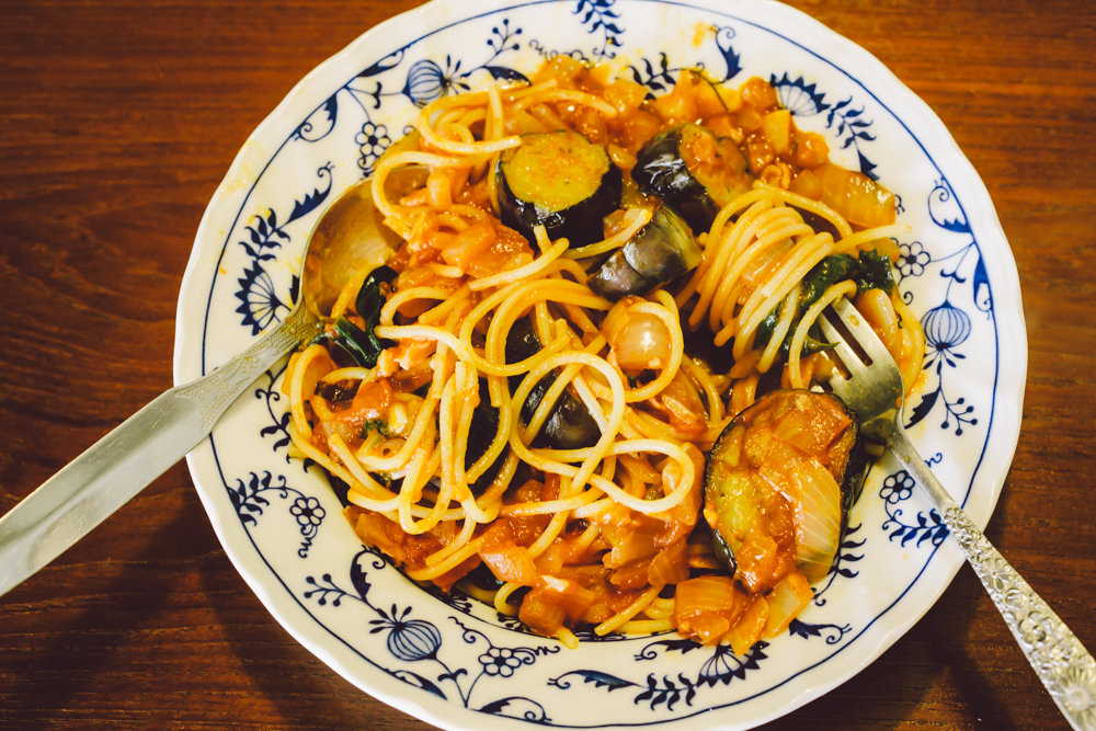 ずっと丸いテーブルが欲しかった。ビンテージで状態がいいのは30万くらい。なんとも恐ろしい値段。 昨日の朝、Harutaの正月セールに出ていた丸くないビンテージのテーブルを夫に勧めてみる。「すーちゃんは丸いのが欲しかったんでしょ、丸にしなよ。」セール品は諦める事にした。だけど、そ んな矢先にネットでたまたま吉祥寺のPleaseで破格の丸テーブルを発見。連日ベッドから起きてこない夫を叩き起こして電車で向かった。今日の朝、一番で到着。「このテーブルは 料理映えするね。」ご機嫌そうに夫が言った。ようこそ我が家へ。ランチはトマトと茄子のスパゲッティーにした。