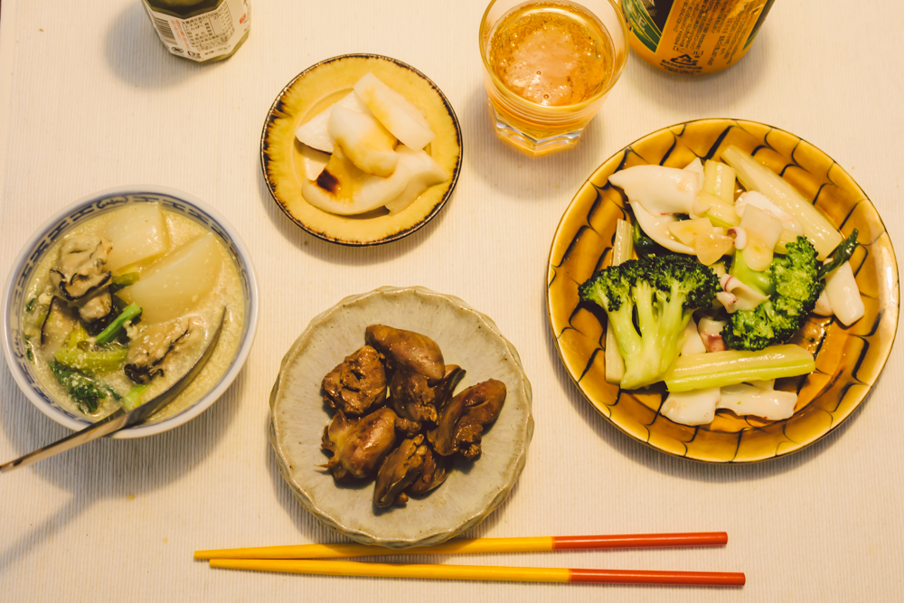 今夜はレバーのソース煮、牡蠣と蕪の豆乳煮、するめいかとブロッコリー、セロリの中華炒め、大根のぬか漬け。後、麦酒。