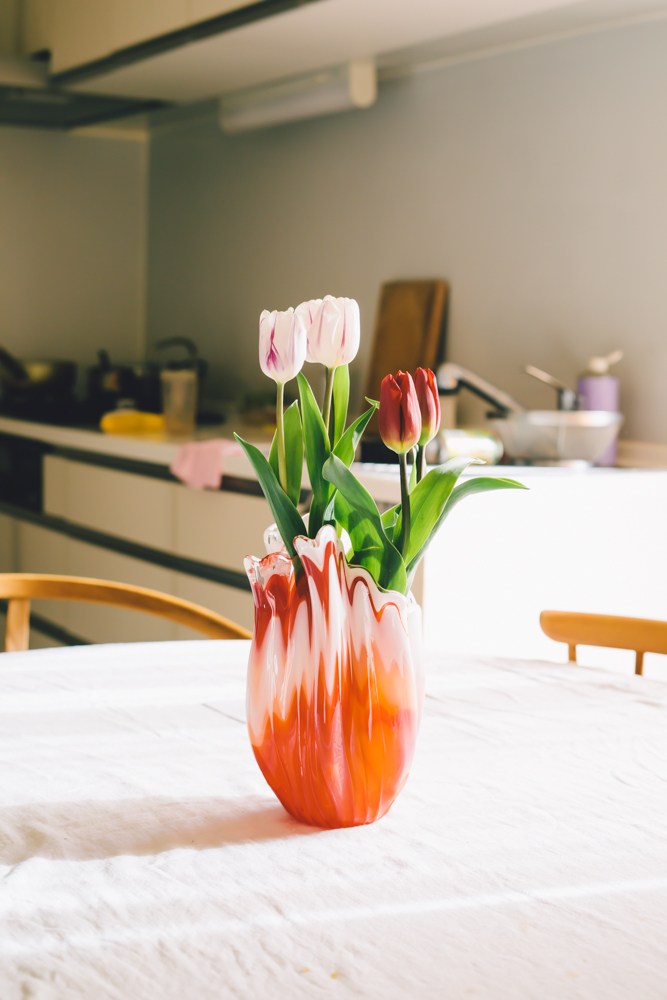 昨日の夕方、三茶で魚屋に寄ったついでにチューリップを2本買って帰った。「こないだ古物市で買った花瓶、難しいんだよね。」「たしかに難しそうだね。あの花瓶自体がチューリップみたいだもんね。」周ちゃんが言った。一昨日に白のチューリップを3本買って活けてみたけど何だか変。う〜ん。あと2本くらい加えたら可愛くなるかな。夜見た時は何だかしっくりこなかったけど、朝になったらいい感じだった。うん。素敵。