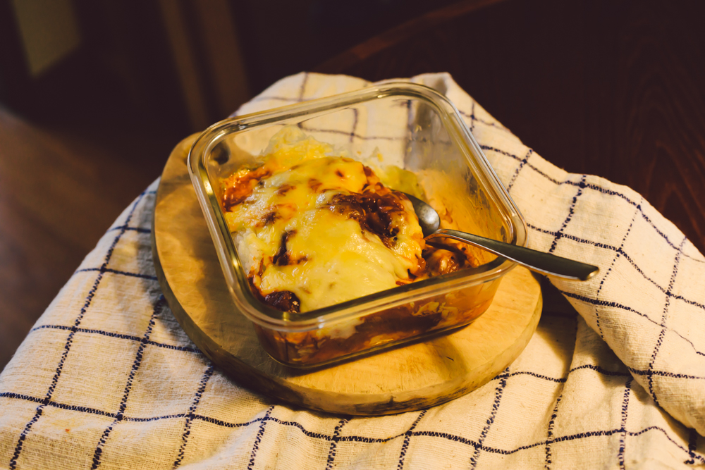 昨日のチキンカレーの残りにチーズをかけて、オーブンで焼く。30分もしたら、焼きカレーの出来上がり。熱々をハフハフしながら、食卓で頬張る。