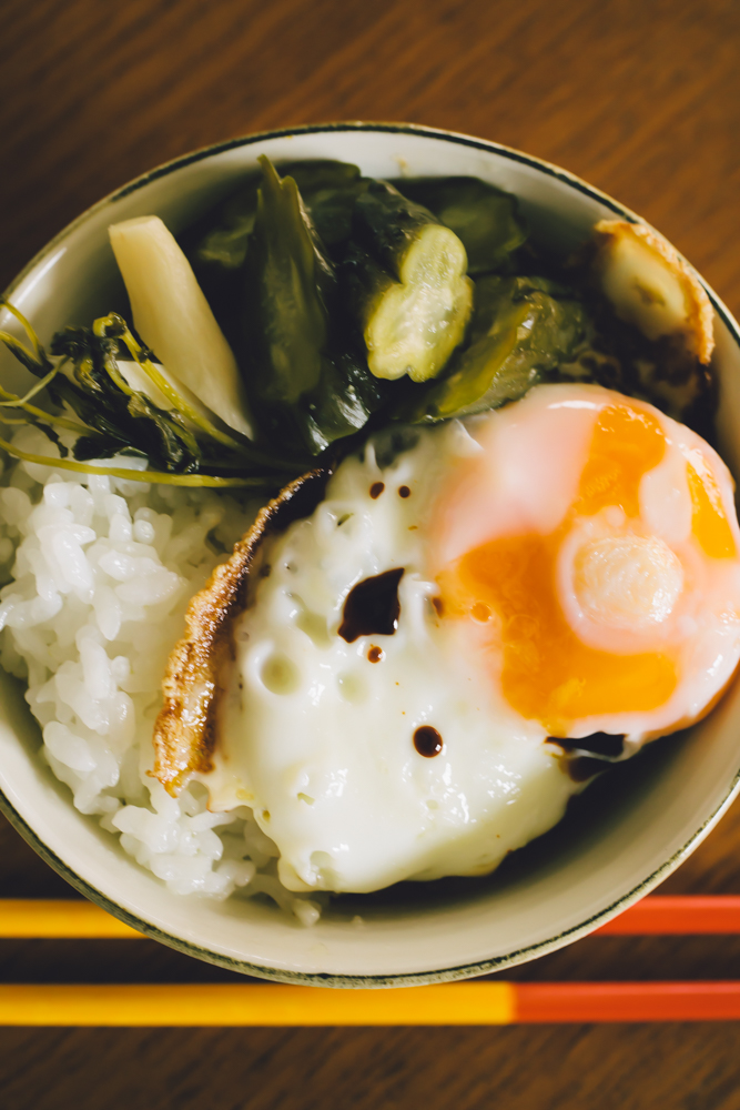 そんな日はやっぱり、卵ご飯。あとは、豚汁の残りと糠漬け。