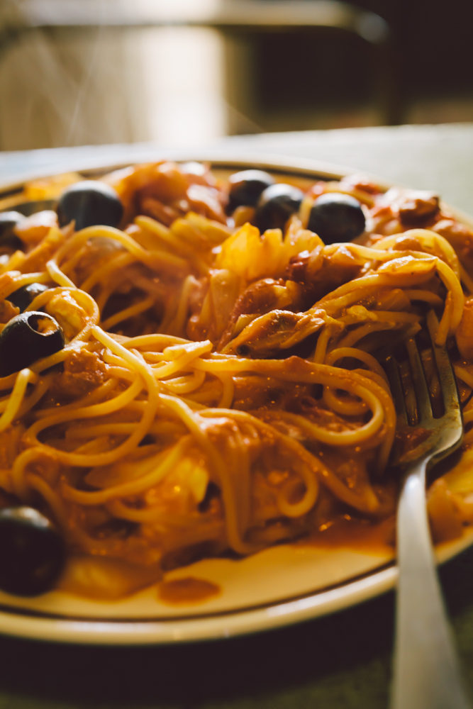 仕事から帰ったら3時だった。そりゃお腹ぺこぺこなわけだ。キッチンへ直行して大きなお鍋に湯を沸かし、玉ねぎ、にんにくを切る。オリーブオイルをひいたフライパンへぽんぽんと入れていく。シーフードミックス、トマト缶、黒オリーブ、昆布茶を入れてグツグツと煮込む。茹で上がったパスタ、オリーブオイル大さじ1をフライパンへ入れて、トングでぐるぐる回すと、そのうちにソースがとろっとしてくる。最後にクリームチーズを入れてざっくり混ぜ合わせて出来上がり。好きなものは一番いい場所から食べたい。だから真ん中に、フォークを入れて食べ始める。一番あっつあつのところから。
