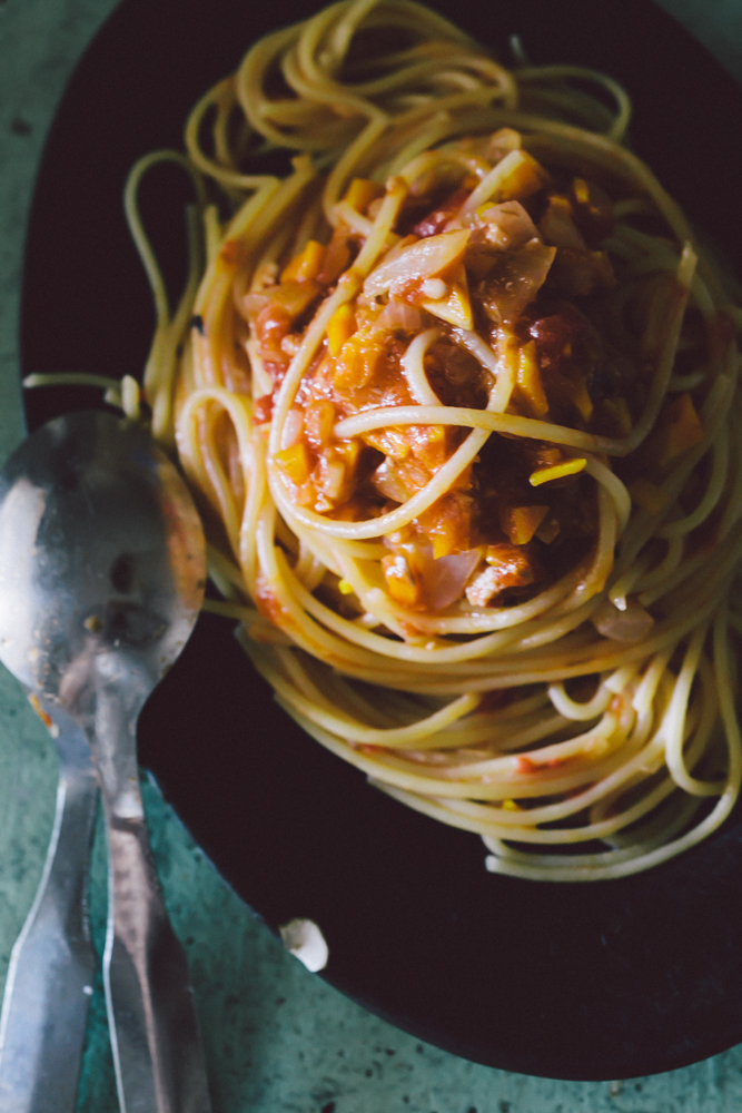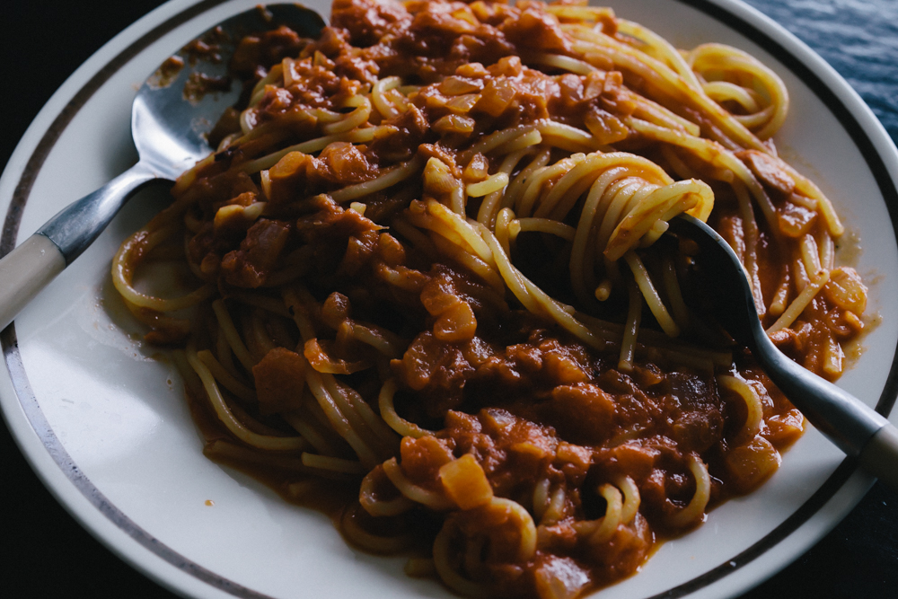 お肉が苦手だからか、ミートソースの肉にくしさや、あのボロボロ感が厭だった。だからうちでは、野菜を結構多めに入れる。そうすると、お野菜の水分が、油っぽいじゃないジューシー!って感じでみずみずしくって美味しくなる。