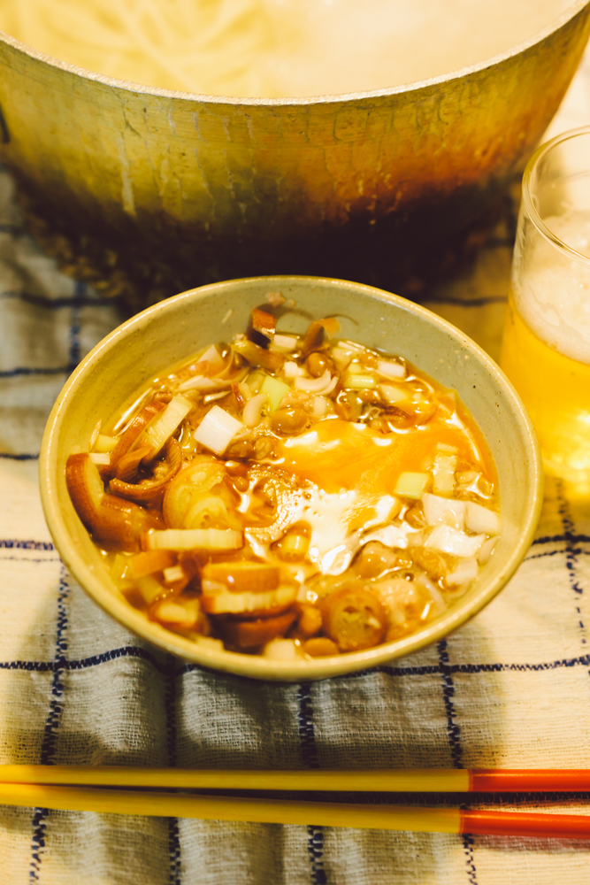 中目黒のBRICK&MORTARさんの事務所でときどき山形会をやる。山形県民達が集まって郷土料理を食べ、酒を飲み、わいわいと騒ぐだけの会。そして、私は山形が大好きな人代表として参加してる。みんなが山形の話で盛り上がっているのを、へぇーって聞いてビールを飲む。先日の郷土料理は、納豆汁と、ひっぱりうどん。早速、今夜の我が家にひっぱりうどんを作ってみた。家族でひっぱって食べるからひっぱりうどん。なんて素敵なネーミング。