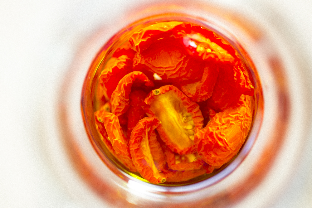 ベランダで数日乾かしていたドライトマトにオリーブオイルを浸したら、不安を覚えるような魅力に飲み込まれそうになった。綺麗。