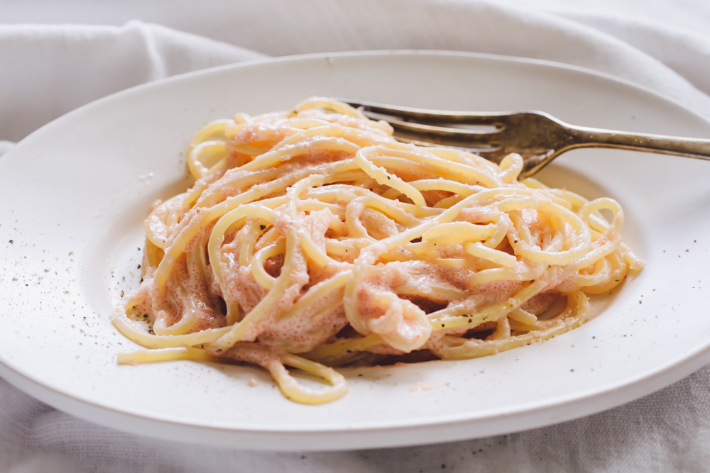 30才そこそこで、師匠の元を独立してぷらぷらしていた私は日々明太パスタに埋もれていた。弟子入りしてみたものの、やっぱり商業は合わないと直ぐにやめたくなったアシスタント業、師匠に迷惑をかけたくないの一心で続けた。そんなアシスタント業をふんわり卒業した頃だった。夫がやっていたバーの料理を私が担当していて、口うるさい夫(本人曰く「全国をツアーで回っているから俺はグルメなんだ。」そう、だけど真実は闇。)を唸らせる料理を色々と考案した。パスタは幼少の時にボンゴレ狂になって以来、いつしかパスタのパの字も出てこなくなって数十年。明太パスタなんて人生で片手くらいしか食べたことが無かった。魚の卵と麺だけなんて、身体に悪くて変な食べ物だなぁと思っていた。どうしてこのレシピに辿り着いたのか全く覚えてないけど、色々がちょっとずつ変化してこうなった。超がつくジャンクレシピ。
