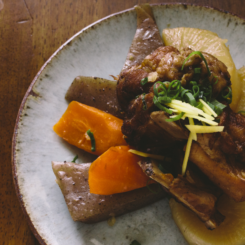 大きく切った豚骨を油で炒め、焼酎をかけて1、2時間ほどよく煮込みます。大根、こんにゃく、人参を足し、出汁、砂糖、合わせ味噌を入れてさらに1時間ほど煮込みます。